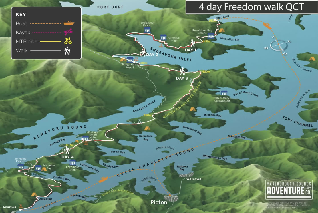 步道穿梭於瑪律堡峽灣(Marlborough Sounds)的山脊與海岸線之間,沿途你將欣賞到夏洛特女王峽灣和凱內普魯峽灣(Kenepuru Sound)的壯麗景色。