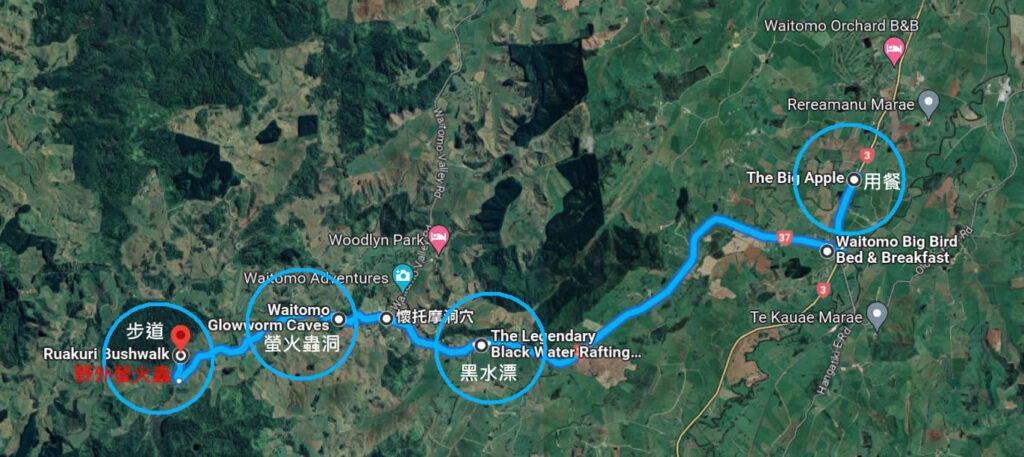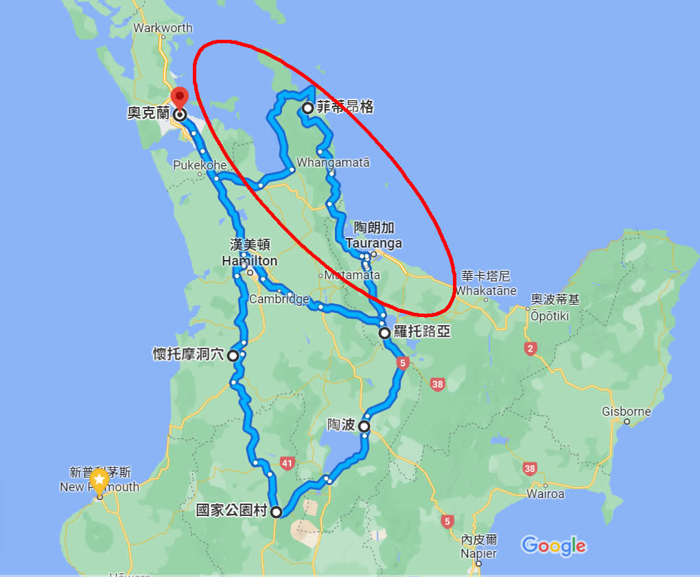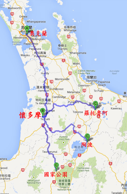 懷多摩Waitomo 從四面八方都可以到懷多摩可以從A.奧克蘭、羅托魯阿或陶波湖搭車往懷多摩奧克蘭到懷多摩,距離194km羅托魯阿到懷多摩,距離141km陶波到懷多摩,距離150km國家公園到懷多摩,開車距離143km以上都是google開車的距離,都是2到2.5就可以到的距離。搭車的話,花費的時間,當然超過這個,而且很多地方,需要轉車。 從奧克蘭出發,經過懷多摩,到了國家公園,然後再順著陶波、羅托魯阿,玩回奧克蘭,就是一個很典型的北島的行程。如果還有時間,可以加上右上角紅色橢圓形圈起來的那一塊,去Coromandel。